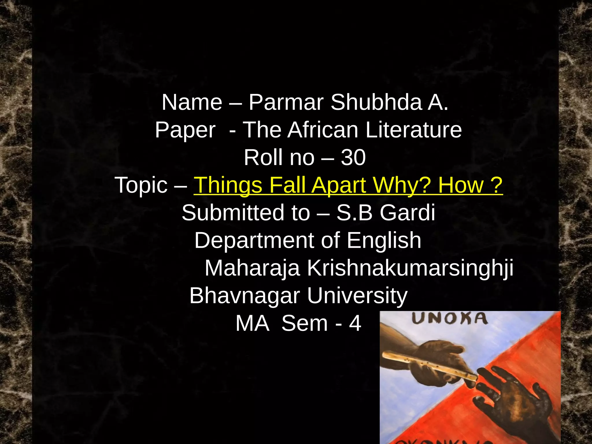 This document is a paper submitted by Parmar Shubhda A. on the topic "Things Fall Apart Why? How?" about the novel by Chinua Achebe. The paper discusses how Achebe presents the Igbo culture and traditions in Nigeria to build cultural pride. It focuses on the main character Okonkwo, a wealthy farmer who is proud of Igbo traditions but struggles as missionaries arrive and convert his village, destroying their way of life. Unable to accept this change, Okonkwo's grasp on his own life and community falls apart, ultimately leading to his defeat.