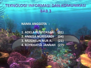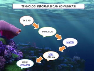 Dokumen ini berisi informasi mengenai anggota kelompok serta standar kompetensi dan materi pembelajaran dalam teknologi informasi dan komunikasi, termasuk cara membuat tabel, grafik, dan diagram. Terdapat juga latihan soal beserta kunci jawabannya untuk menguji pemahaman siswa tentang penggunaan fitur di program Microsoft PowerPoint. Materi tersebut dirancang untuk meningkatkan kemampuan siswa dalam membuat presentasi yang efektif.