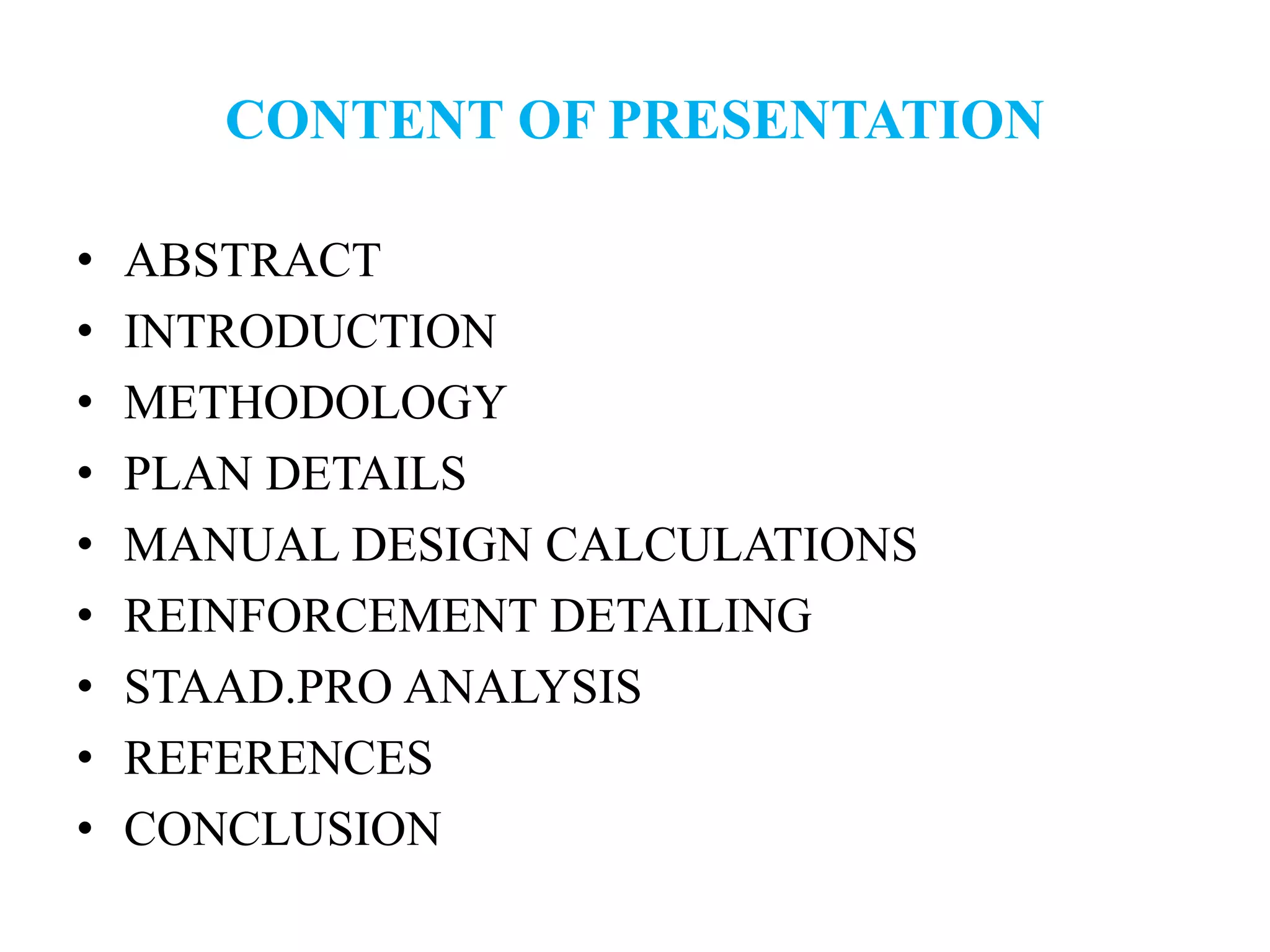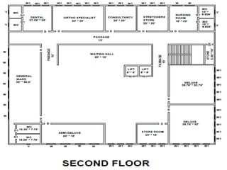 This document provides details on the planning, analysis, and design of a multi-specialty hospital building project. It includes sections on the abstract, introduction, methodology, planning details, manual design calculations of structural elements according to IS codes, reinforcement detailing, STAAD analysis, references, and conclusion. The proposed hospital is a G+2 building located in Gomangalamputhur with facilities distributed across floors for administrative functions, wards, operating theaters, and more.
