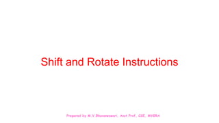 The document discusses various shift, rotate, and string manipulation instructions for the 8086 microprocessor. It provides examples of instructions like ROL, ROR, RCL, RCR, SHL, SHR, SAR, CMPS, SCAS, MOVS, LODS, and STOS. It also covers unconditional transfer instructions like CALL, RET, and JMP as well as conditional instructions like JE, JNE that check status flag values before transferring control.