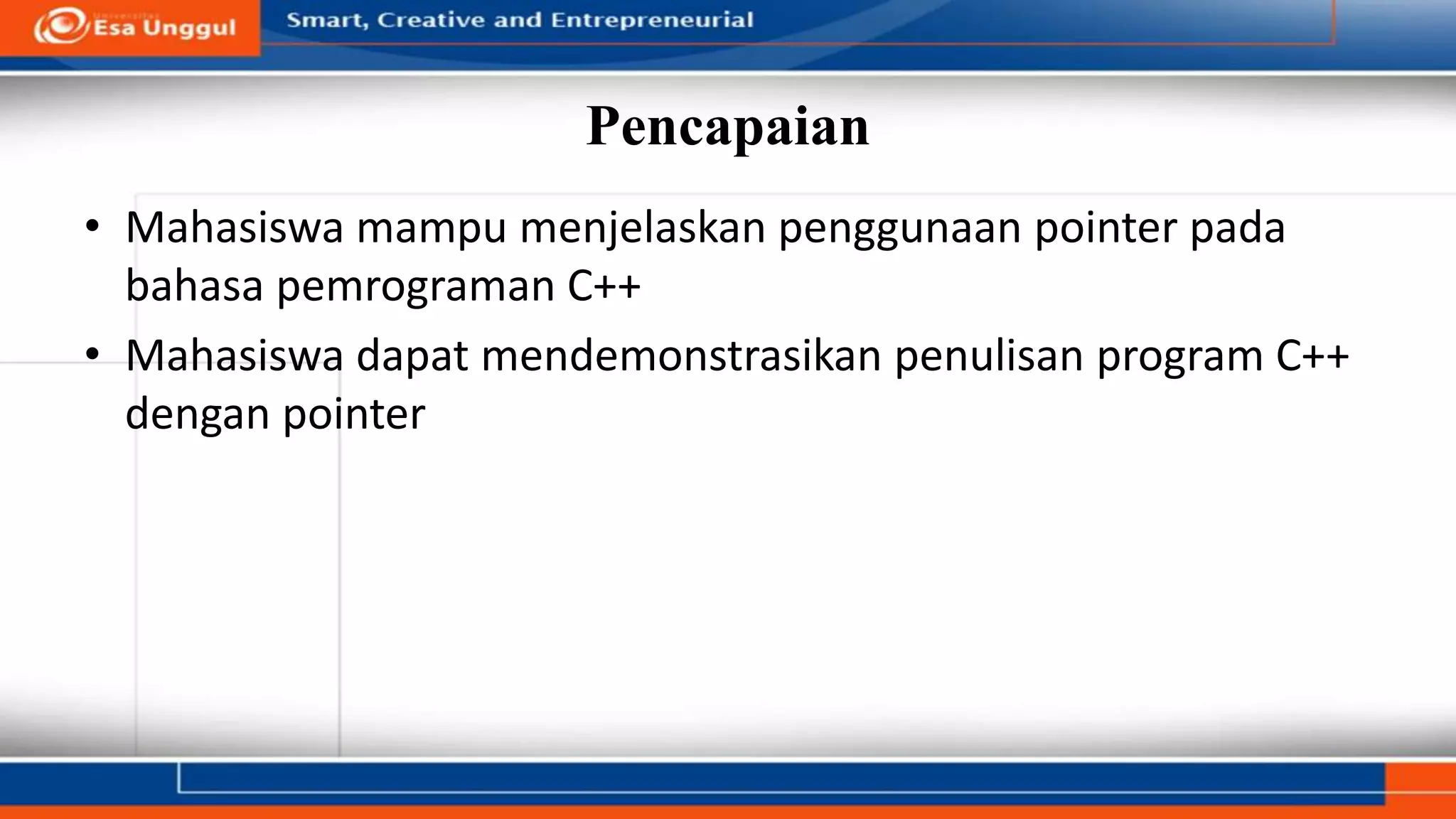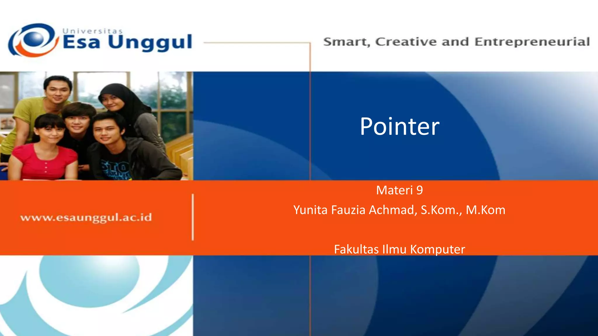 Dokumen tersebut membahas tentang pointer pada bahasa pemrograman C++. Pointer merupakan variabel yang menyimpan alamat memori dari variabel lain. Dokumen tersebut menjelaskan pengertian, kegunaan, jenis operator, dan contoh penulisan program C++ menggunakan pointer untuk menunjuk variabel, array, string, dan pointer lainnya. Terdapat juga latihan soal untuk menguji pemahaman tentang pointer.