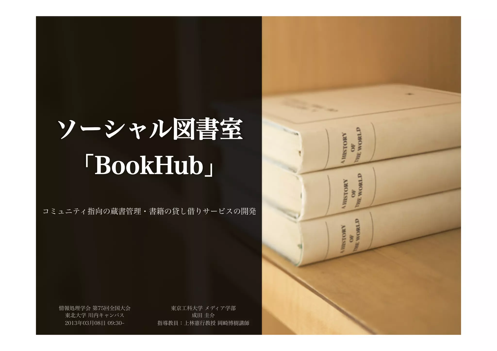 2013.03.08に東北大学でおこなわれた情報処理学会 第75回全国大会での研究発表のスライド です。 ソーシャルメディア・コンテンツ管理[5N会場] 『ソーシャル図書室「bookHub」:コミュニティ指向の蔵書管理・書籍の貸し借りサービスの開発』 http://bookhub.jp/