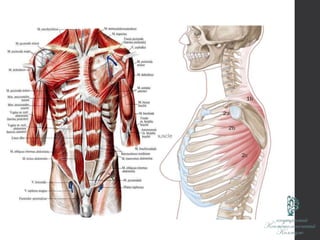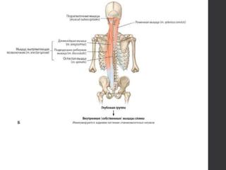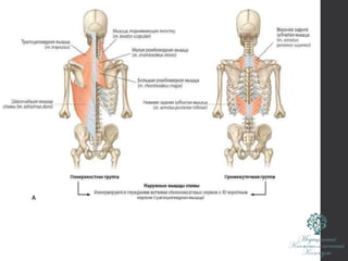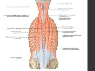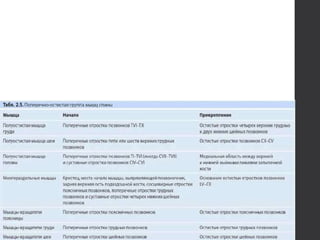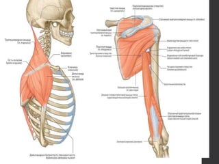 Документ описывает анатомию и функции скелетных мышц человека, включая их строение, классификацию и различные функциональные группы. Представлены характеристики мышечных волокон, их расположение и роль в движении, дыхании и поддержании равновесия тела. Также рассматриваются физиологические состояния мышц и их взаимодействие с нервной системой.