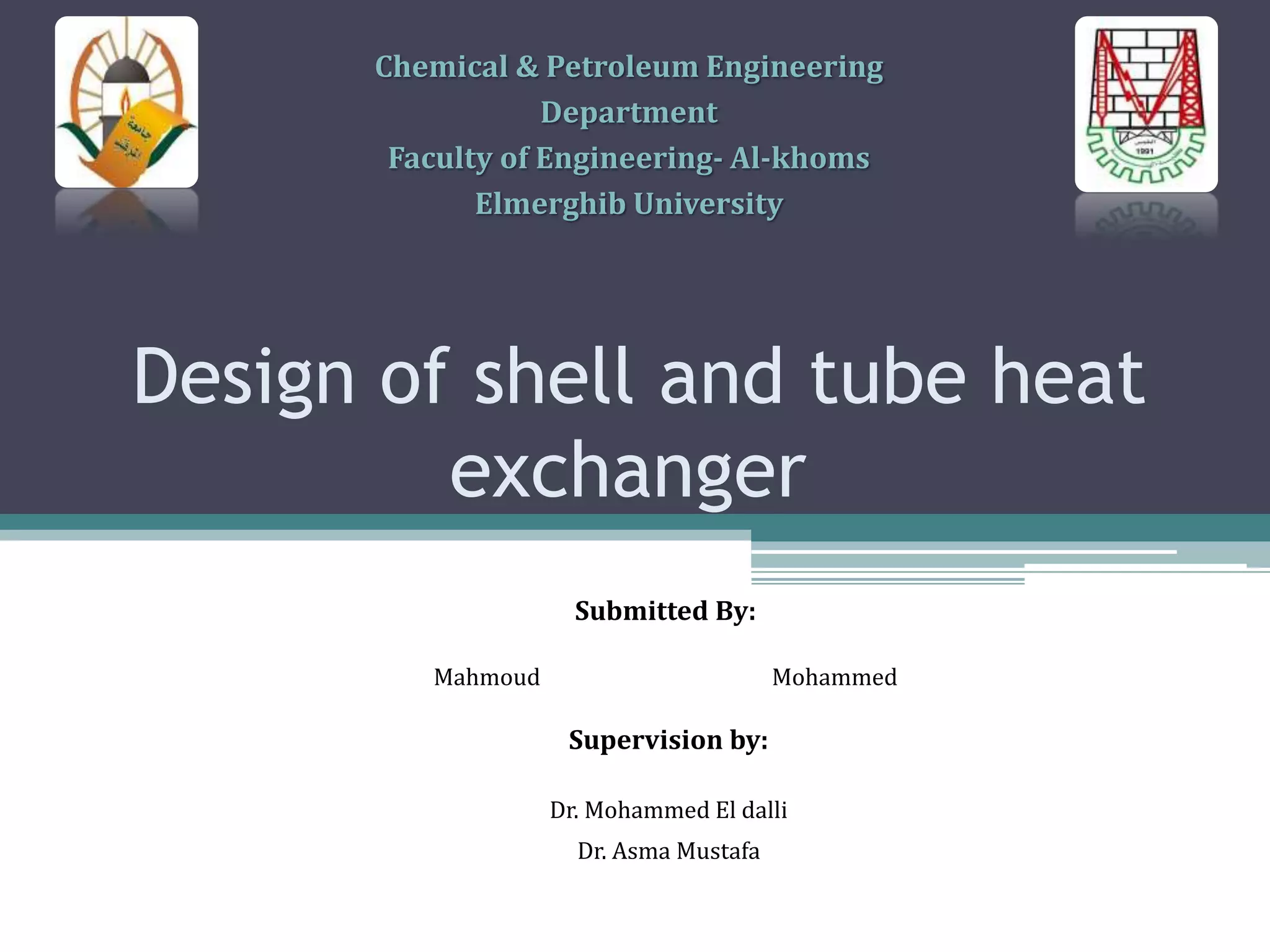 This document describes the design of a shell and tube heat exchanger. Gas oil at 200°C needs to be cooled to 40°C using cooling water available at 30°C, with the water's maximum temperature rise being 20°C. The design calculations are shown to size a heat exchanger for this duty, with a mass flow rate of 22,500 kg/h for the gas oil and 98,181 kg/h for the water. Key design parameters calculated include heat transfer area, number of tubes, tube arrangement, and pressure drops. The total cost of the designed exchanger is estimated to be around $131,398.