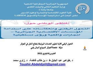 تناقش الورقة مفهوم التحول الرقمي وأهداف أنظمة النقل الذكية مع التركيز على تجربة شركة يسير كنظام ذكي للنقل العام في الجزائر. تؤكد الوثيقة على أهمية التكيف المستمر مع المتغيرات البيئية ودمج التكنولوجيا الحديثة لتحسين الكفاءة والخدمات. تقدم شركة يسير نموذجًا ناجحًا يُظهر كيف يمكن للتحول الرقمي تعزيز التنافسية وجودة الخدمات في قطاع النقل.