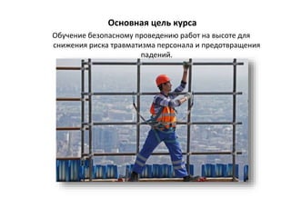 Документ описывает основы безопасности при проведении работ на высоте, включая важные определения, типичные опасности и требования к безопасному выполнению работ. Основное внимание уделяется обучению и использованию систем защиты от падений, таких как предохранительные пояса и страховочные устройства. Курс включает теоретическую часть и практические занятия для закрепления полученных знаний и навыков.