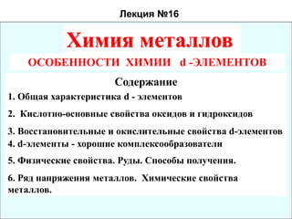 Лекция охватывает химию d-элементов, включая их общие характеристики, кислотно-основные свойства, и восстановительные/окислительные качества. Рассматриваются физические свойства, способы получения и сравнительный анализ d- и p-элементов. Также описываются методы получения металлов, их руды и реакционные свойства.