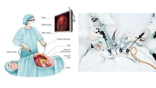Georg Kelling first introduced experimental laparoscopic procedures in 1901, though it took several decades for laparoscopy to become widely adopted. Laparoscopic surgery has significant short-term benefits over open surgery such as less postoperative pain, shorter hospital stays, and faster return to normal activities. However, long-term outcomes like cancer survival rates have not been conclusively shown to be equivalent. Robotic surgery systems were later developed to address some limitations of laparoscopy like loss of tactile feedback and ergonomic challenges, providing benefits such as 3D visualization, tremor filtering, and improved instrument maneuverability. Both laparoscopic and robotic procedures require special considerations regarding patient selection, trocar placement, hemostasis, and potential