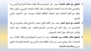 تتناول الوثيقة نظام الساعات المعتمدة في التعليم الجامعي وكيفية تطبيقه في جامعة بنها، مستعرضة مزايا هذا النظام مثل المرونة والكفاءة المؤسسية. كما تشير إلى ضرورة تطوير المناهج الدراسية لربط المخرجات التعليمية باحتياجات سوق العمل. تهدف الوثيقة إلى وضع إطار موحد لتطوير البرامج الأكاديمية وضمان جودتها.