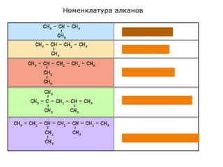Документ описывает алканы как предельные углеводороды с простой связью между атомами углерода и hybridization sp3. Рассматриваются их физические и химические свойства, включая реакции горения и замещения. Также представлены номенклатура алканов и примеры изомерии.
