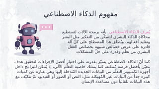 الذكاء عرفُي بأنه لتستطيع اآلالت برمجة البشر مثل التفكير من نّلتتمك البشري الذكاء محاكاة آلة ّلك على المصطلح هذا طلقُيو ،أفعالهم وتقليد العقل بخصائص شبيهة خصائص عرض على قادرة المشكالت ّلح على وقدرة مّتعل من البشري هدف لتحقيق اإلجراءات أفضل اختيار على بقدرته زّيتمي االصطناعي الذكاء ّنأ كما داخل للبرامج مكنُي إذ ،اآللي مّالتعل خاصية يمتلك كما ،مكنةُم فرصة بأفضل نّمعي كميات عن عبارة وهي إليها دخلةُمال الجديدة البيانات من مّالتعل الكمبيوتر أجهزة مع فّتتكي ّمث ،الفيديو أو الصور أو النص :مثل هيكلةُمال غير البيانات من ًجدا كبيرة اإلنسان مساعدة دون ًتلقائيا البيانات هذه
