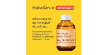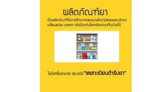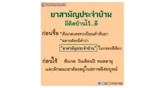 เลขทะเบียนตารับยา • ปริมาณยาหรือขนาดบรรจุของยา • เลขที่หรืออักษรครั้งที่ผลิต • วันเดือนปีที่ผลิต / วันเดือนปีที่หมดอายุ • ข ้อความระบุประเภทยา คาว่า ยาอันตรายยาควบคุมพิเศษ ยาใช ้เฉพาะที่ หรือยาใช ้ภายนอก • ขนาดและวิธีใช ้ยา • คาเตือนหรือข ้อควรระวังอาการข ้างเคียงของยา • วิธีการเก็บยา การอ่านฉลากยา