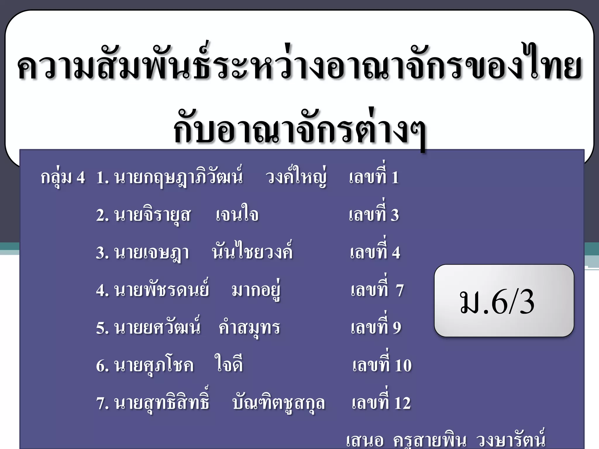 างอาณาจักรของไทย กับอาณาจักรต่ างๆ กลุ่ม 4 1. นายกฤษฎาภิวฒน์ วงค์ใหญ่ ั เลขที่ 1 2. นายจิรายุส เจนใจ เลขที่ 3 3. นายเจษฎา นันไชยวงค์ เลขที่ 4 4. นายพัชรดนย์ มากอยู่ 5. นายยศวัฒน์ คาสมุทร เลขที่ 7 เลขที่ 9 ม.6/3 6. นายศุภโชค ใจดี เลขที่ 10 7. นายสุ ทธิสิทธิ์ บัณฑิตชู สกุล เลขที่ 12 เสนอ ครูสายพิน วงษารัตน์