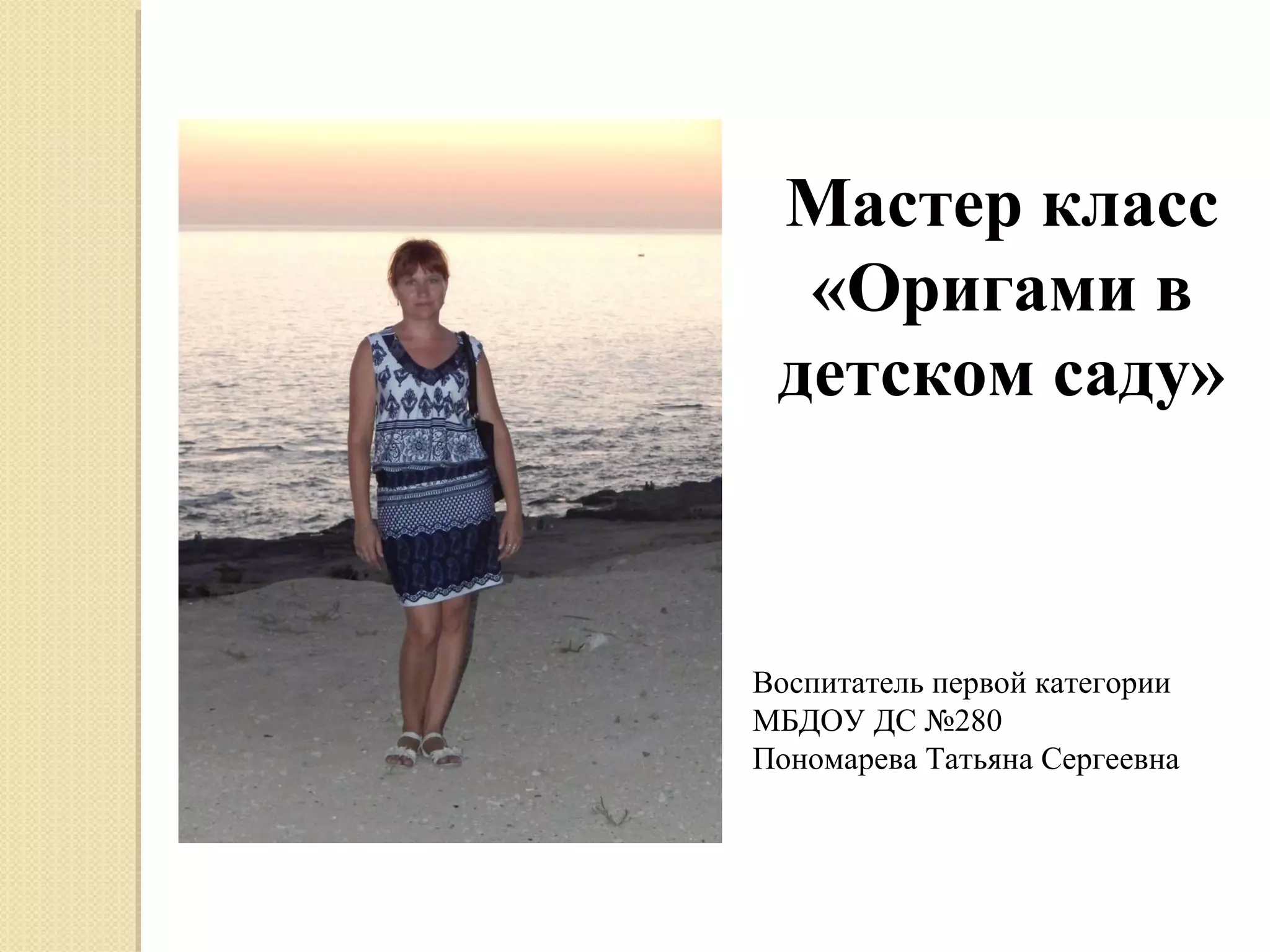 Мастер-класс «Оригами в детском саду» предлагает методы развития у дошкольников конструктивных и творческих способностей через освоение японской техники оригами. Основные задачи обучения включают знакомство с геометрическими понятиями, развитие мелкой моторики и логического мышления, а также формирование интереса к искусству. Используются различные методические приемы для вовлечения детей в творческий процесс, включая диалогическую речь и самоконтроль.