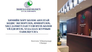 ХИМИЙН ХОРТ БОЛОН АЮУЛТАЙ БОДИС ЭКСПОРТЛОХ, ИМПОРТЛОХ, ХИЛ ДАМЖУУЛАН ТЭЭВЭРЛЭХ БОЛОН ҮЙЛДВЭРЛЭХ, ХУДАЛДАХ ЖУРМЫН ТАНИЛЦУУЛГА www.advocate.mn