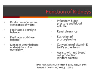 The document discusses kidney function and kidney failure. The kidneys play a vital role in regulating fluid, electrolyte and acid-base balance. Kidney failure occurs when the kidneys are no longer able to perform these functions. There are two main types of kidney failure - acute renal failure, which develops rapidly over hours to days, and chronic renal failure, which is a gradual and progressive loss of function over months to years. Treatment for kidney failure includes medications, dialysis and kidney transplantation.