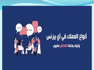 تناقش الوثيقة مفهوم وأهمية خدمة العملاء وكيفية تقديم تجربة متميزة للعميل، مع التركيز على نوعية العملاء المختلفة وكيفية التعامل معهم. تشمل الأفكار الرئيسية تصور احتياجات العملاء وتلبية توقعاتهم، بالإضافة إلى استراتيجيات لتحسين التواصل والتفاعل مع العملاء. كما تتعرض الوثيقة لتسع أنواع من العملاء وطرق فعالة في التعامل معها لضمان رضاهم وزيادة ولائهم.