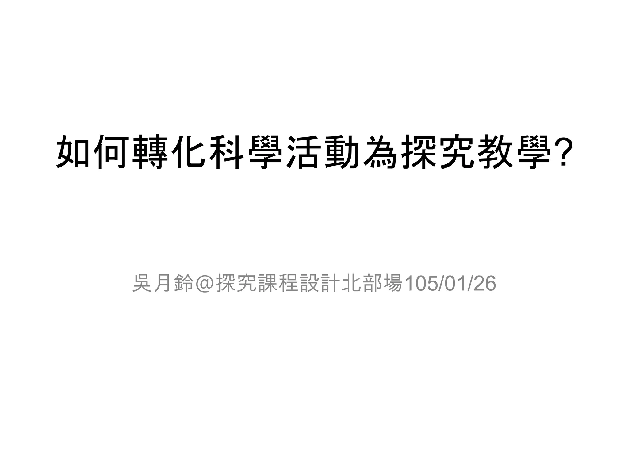该文档探讨了将科学活动转化为探究教学的方法,以“隔空灭火”实验为例,强调引发学生动机和确定学习任务的重要性。文中提到的关键步骤包括实验观察、设计实验和修正学习表现,旨在培养学生的科学能力和合作态度。最终目标是通过探究过程完成专题研究并提升学生的科学素养。