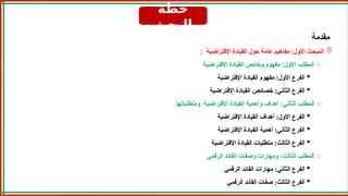 القيادة نجاح ودعائم وشروط مبررات :الثاني المبحث : o ومعوقاتها ومبرراتها والتقليدية اإلفتراضية القيادة بين الفرق :األول المطلب والتقليدية اإلفتراضية القيادة بين الفرق :األول الفرع اإلفتراضية القيادة مبررات :الثاني الفرع اإلفتراضية القيادة معوقات :الثالث الفرع o اإلفتراضية القيادة و القادة نجاح ودعائم شروط :الثاني المطلب اإلفتراضية القيادة نجاح شروط :األول الفرع الرقميين القادة نجاح دعائم :الثاني الفرع o اإلفتراضية القيادة وسلبيات إيجابيات :الثالث المطلب اإلفتراضية القيادة إيجابيات :األول الفرع اإلفتراضية القيادة سلبيات :الثاني الفرع خاتمة المراجع