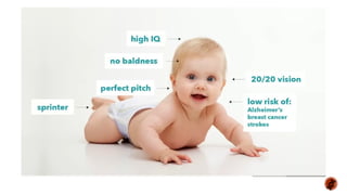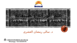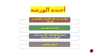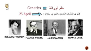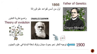عرض تقديمى حول "علم الوراثة: من النظرية إلى التطبيق" يتناول تاريخ علم الوراثة وأهميته، ويستعرض تطبيقاته الحديثة في مجالات الطب والزراعة والبيئة والصناعة، مثل التشخيص الجيني والعلاج الجيني وتحسين المحاصيل والحفاظ على التنوع البيولوجي وإنتاج الوقود الحيوي، ويقدم نظرة شاملة على كيف يغير علم الوراثة حياتنا.