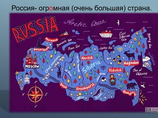 Россия — большая страна в Евразии с разнообразными климатическими условиями и сезонами. Москва является столицей, а Санкт-Петербург известен Эрмитажем, среди множества достопримечательностей. Русские работают с понедельника по пятницу, а отдыхают в выходные и праздники.