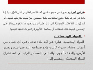 تناقش الوثيقة خصائص المواد الهندسية وأنواعها، حيث يتم تصنيف المواد إلى معدنية وغير معدنية، وتستعرض الخصائص الفيزيائية والميكانيكية والكيميائية المطلوبة لكل نوع. كما تتناول العلاقة بين التركيبة الكيميائية للمواد والخصائص الهندسية اللازمة لاستخدامها في التطبيقات المعمارية والصناعية. الوثيقة تتضمن أيضًا شرحًا عن ذرات العناصر وأنواع الروابط الكيميائية المؤثرة في خصائص المواد.