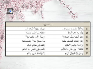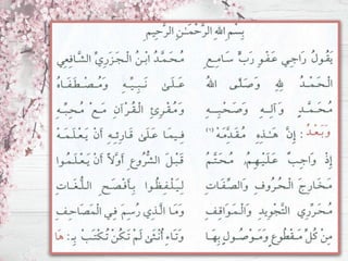 يتحدث الوثيقة عن علم التجويد وأهمية قراءة القرآن بشكل صحيح وكيفية نطق الحروف وآداب القراءة. يبدأ النص بذكري اسم مؤلف الكتاب ابن جزري وسبب اختياره لبدء عمله بآيات من القرآن. كما يتناول الفرق بين القارئ والمقرئ وبعض القواعد والأسس المتعلقة بالتجويد.