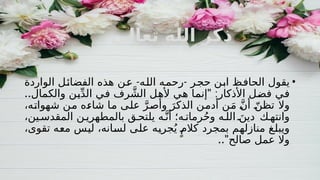 حجر ابن الحافظ عن الواردة الفضائل هذه في " : والكمال ينِّدال في رف َّالش ألهل هي إنما األذكار فضل .. وال ،شهواته من شاءه ما على َّوأصر َالذكر أدمن نَم َّنأ ّتظن ،ين المقدس ن بالمطهري ق يلتح هَّأن ه؛ رماتُحو ه الل َدين ك وانته ،تقوى معه ليس ،لسانه على جريهُي ٍكالم بمجرد منازلهم ويبلغ "صالح عمل وال .. تعالى الله ذكر