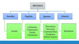 This document provides an introduction to protozoology, the study of protozoa. It discusses the key characteristics of protozoa including their morphology, occurrence in different habitats, modes of locomotion, nutrition, reproduction, life cycles, classification, medical importance as pathogens, mechanisms of transmission and pathogenesis, and approaches to treatment with antiprotozoal agents. The document serves as an overview of protozoa with a focus on those that are medically relevant.