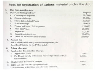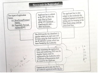 The document outlines the procedure for registering plant varieties under the Protection of Plant Varieties and Farmers' Rights Act (PPVFR) of 2001 in India, detailing types of crops eligible for protection and the registration criteria for different varieties. It also explains the rights of both breeders and farmers regarding the use and commercialization of registered varieties, as well as penalties for infringement and provisions for farmer protections. Additionally, the document includes guidelines for benefit sharing, compulsory licensing, and the renewal process for registrations.