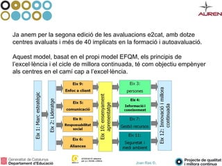 anem per la segona edició de les avaluacions e2cat, amb dotze centres avaluats i més de 40 implicats en la formació i autoavaluació. Aquest model, basat en el propi model EFQM, els principis de l’excel·lència i el cicle de millora continuada, té com objectiu empènyer als centres en el camí cap a l’excel·lència.