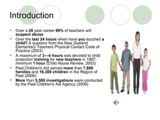 This document provides an overview of child protection issues for principals and vice-principals. It defines the different types of child abuse including physical, sexual, emotional/psychological, and neglect. It outlines indicators of each type of abuse and behaviors observed in abusers. The rights and responsibilities of teachers to report suspected abuse to Children's Aid is also discussed.