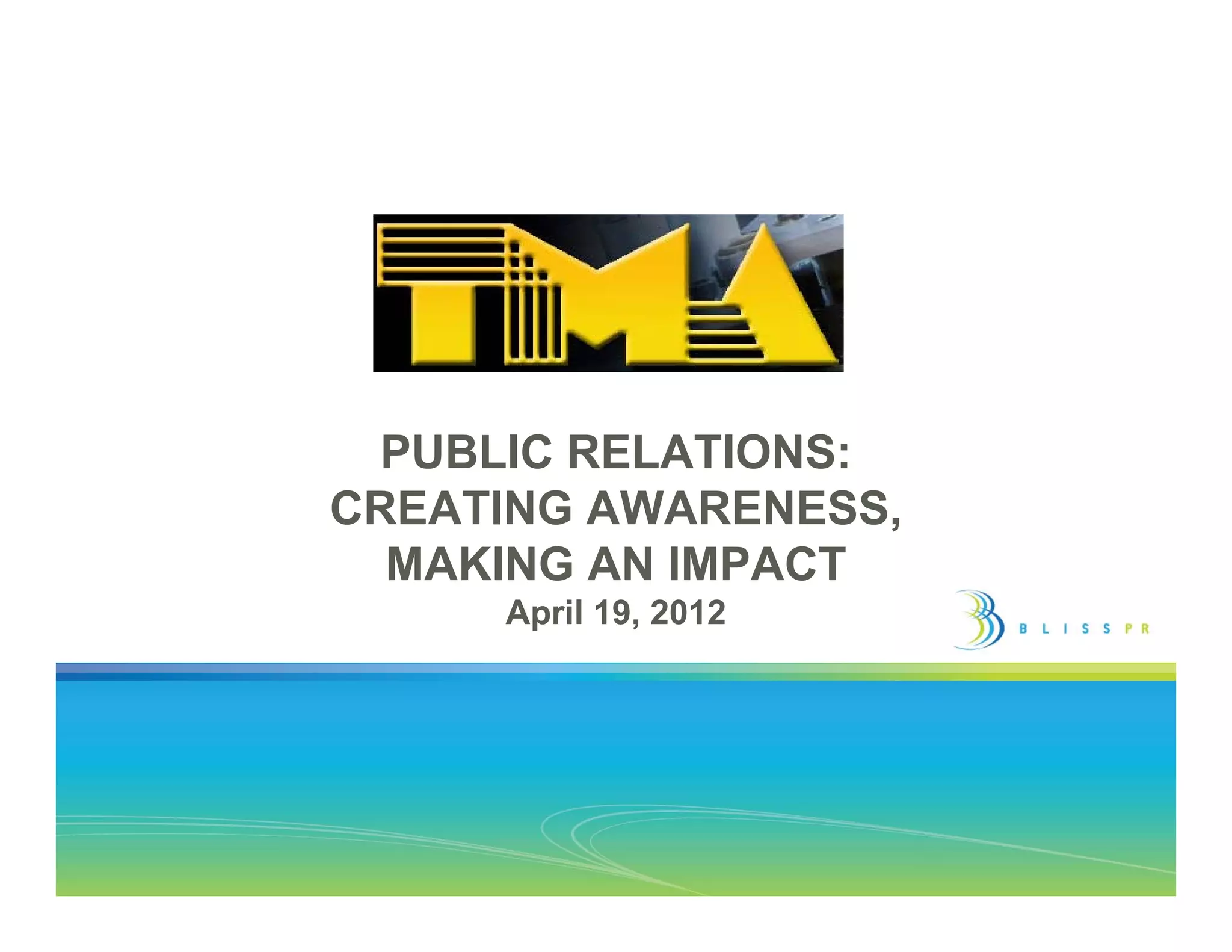 BlissPR is a full-service communications firm that specializes in helping B2B companies enhance their brand through strategic public relations efforts that build relationships and trust. The document outlines the importance of understanding public relations, dispelling common myths, and creating an effective PR strategy through integrated marketing and targeted media relationships. It emphasizes the need for continuous engagement, measuring success through relevant metrics, and focusing on clear messaging aligned with brand attributes.