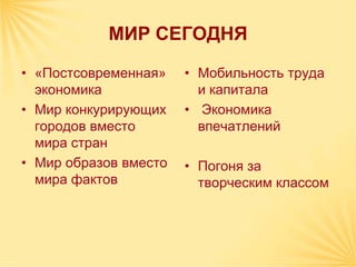 Документ обсуждает методы маркетинга территорий для привлечения туристов и развития местных брендов через символические события, такие как фестивали. Приводятся примеры успешных мероприятий, таких как фестиваль сыра в Алтайском крае, где внимание уделяется как специализированным конгрессам, так и развлекательным программам. Также подчеркивается экономический эффект от туризма и важность стратегического менеджмента для успеха городов как брендов.