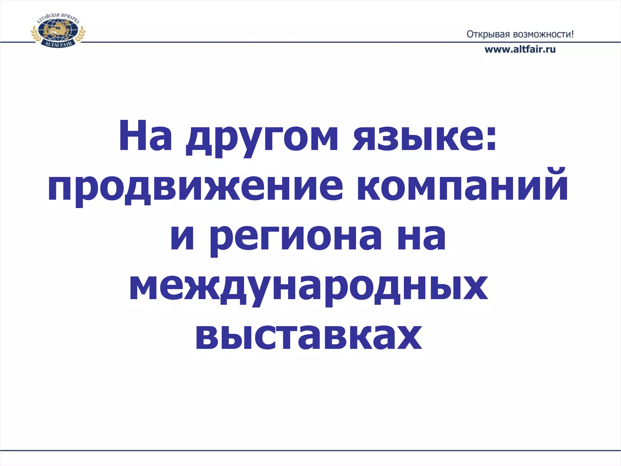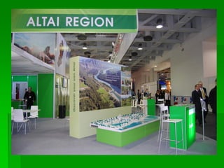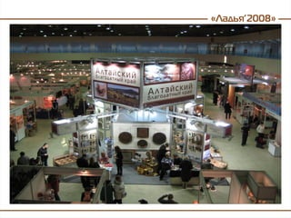 Документ описывает участие Алтайского края в международных выставках с целью продвижения региона и его продуктов на зарубежные рынки. Он выделяет различные формы участия, преимущества коллективных стендов и успешные стратегии для достижения поставленных целей. Также упоминаются конкретные выставки и мероприятия, проведенные с 2007 года, а также задачи, направленные на укрепление имиджа региона и развитие туризма.