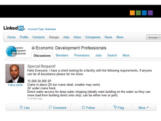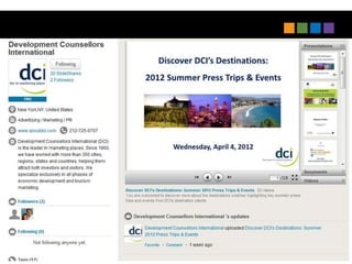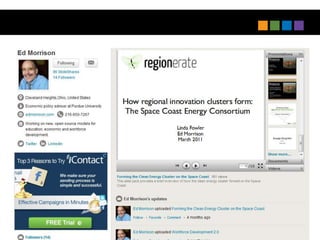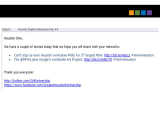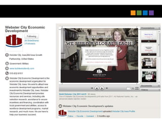 The document outlines next practices for economic development, emphasizing the importance of digital engagement and integrated marketing strategies. Key recommendations include leveraging digital ambassadors, utilizing platforms like YouTube and Pinterest, and rethinking LinkedIn for better connections with investors. It highlights the necessity for speed in communication and adapting content for various media forms to enhance outreach effectiveness.