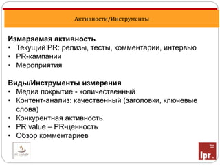 Документ описывает оценку PR-эффективности компании Samsung на примере ее активностей в Белоруссии, включая релизы и мероприятия, осуществленные с 2011 по 2013 год. Представлены данные о медиа покрытии, конкурентной активности и PR-ценности, а также результаты анализа комментариев к продуктам. В заключение упоминается распределение каналов и динамика публикаций, иллюстрирующих восприятие нового смартфона Galaxy S4 среди потребителей.