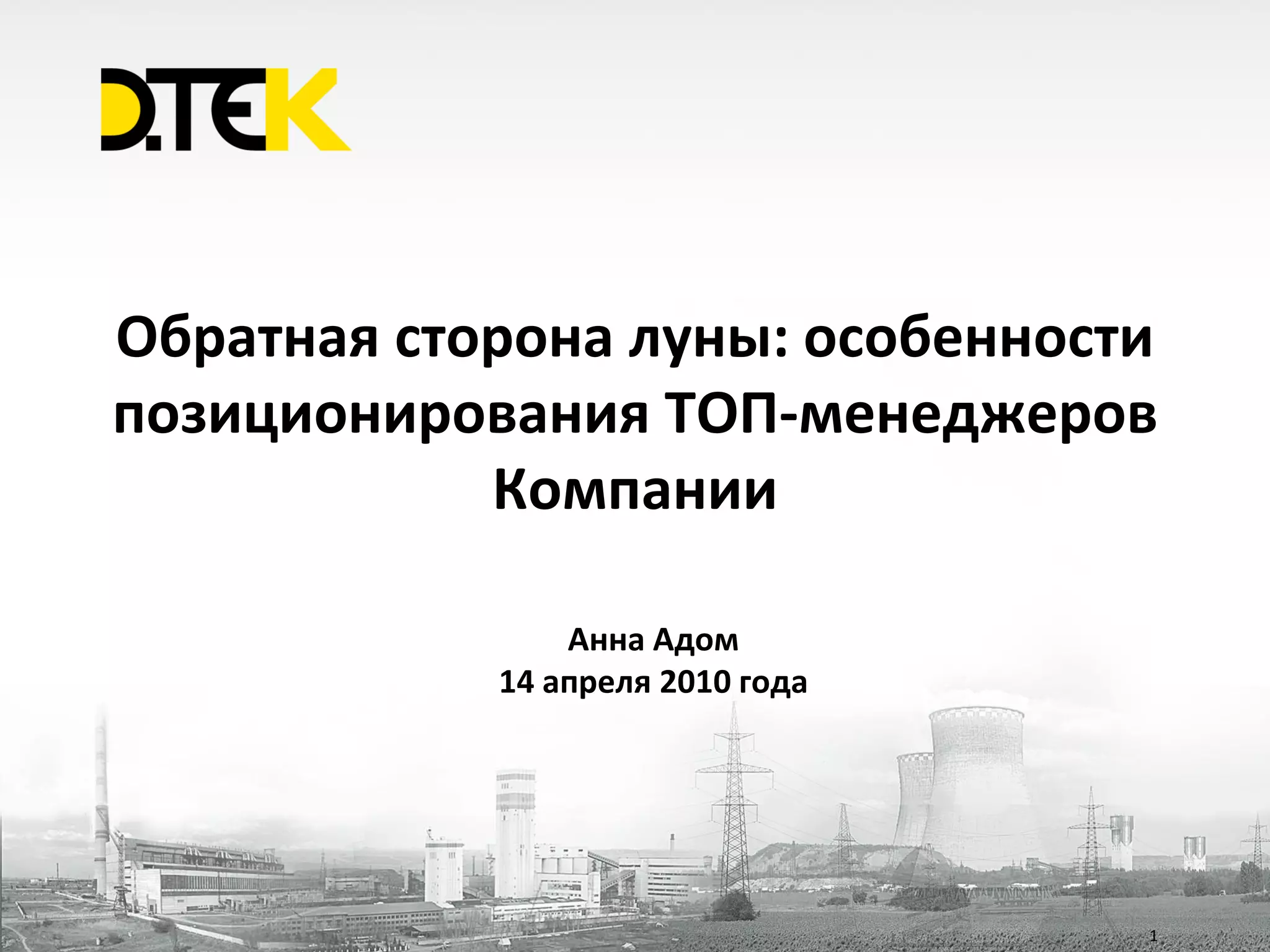 Документ описывает стратегические цели компании ДТЭК, крупнейшего генератора электроэнергии в Украине, и акцентирует внимание на позиционировании топ-менеджеров как важного элемента ее репутационного бренда. Основные моменты включают выбор моделей мотивации, разработку программы позиционирования и анализ медиа-среды для повышения устойчивости компании. Также рассматриваются преимущества и недостатки различных моделей ко-брендинга топ-менеджеров с брендом компании.