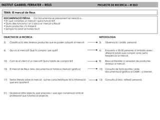 INSTITUT GABRIEL FERRATER– REUS PROJECTE DE RECERCA – 4t ESO TEMA: El mercat de Reus DOCUMENTACIÓ PRÈVIA: Cal documentar-se prèviament en relació a... En què consisteix un mercat i quina funció té? Quins dies funciona i on s’ubica el mercat a Reus? Quins productes s’hi troben? Sempre ha estat al mateix lloc? OBJECTIUS DE LA RECERCA: Classificació dels diversos productes que es poden adquirir al mercat. Qui va al mercat? Què hi compra i per què? Com és el client d’un mercat? Quins hàbits de compra té? El mercat de Reus: breu documentació històrica (textual i gràfica) Textos literaris sobre el mercat: quines característiques té la informació que ens aporten? Qualsevol altre objectiu que proposeu i que sigui consensuat amb el professorat que tutoritza el projecte. METODOLOGIA: Observació i anàlisi personal Enquesta a 30-50 persones d’ambdós sexes i diferents edats que comprin amb certa freqüència al mercat. Breus entrevistes a venedors de productes diversos al mercat. Consulta de fonts escrites i orals; documentació gràfica al CIMIR i a internet. Consulta al bloc; reflexió personal.