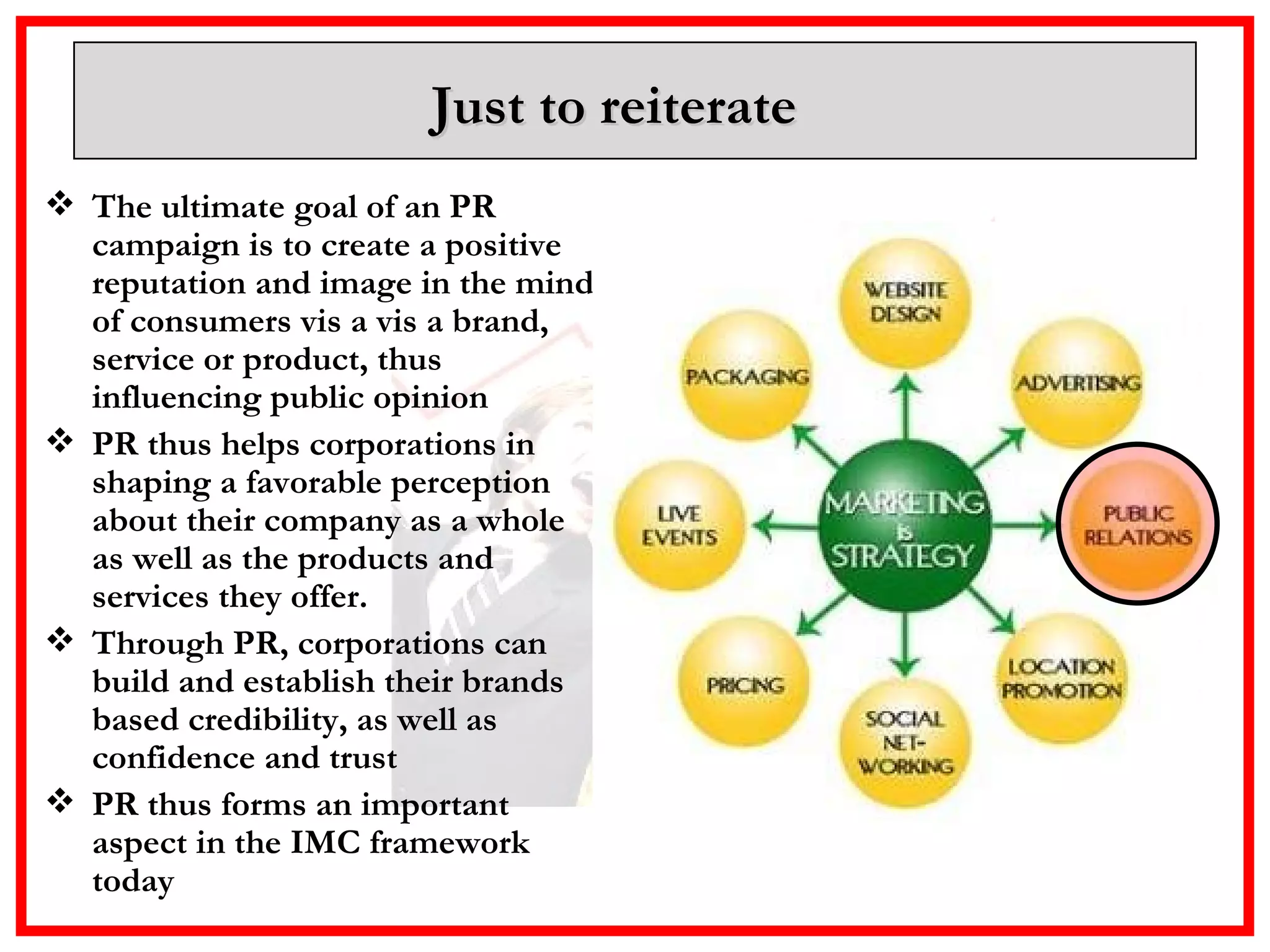 The document discusses the growing importance of public relations (PR) in integrated marketing communications (IMC). It discusses how PR helps shape positive public perception of brands and companies to build credibility and trust. It also examines how PR practitioners can influence media coverage and public opinion through strategic PR campaigns, using the National Basketball Association as a case study. The document also covers trends in PR, including the rise of social media and emphasis on evaluating PR outcomes.