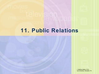 Public relations has evolved from ancient times where rulers used statues and coins to shape public perception, to the modern practice of strategically influencing media coverage and public opinion. Early pioneers like Ivy Lee established the principles of openness and honesty in public relations. Edward Bernays further developed the field and taught that public relations aims to "engineer public support" through information and persuasion. Today, public relations professionals perform roles like writing, media relations, and crisis communication across various types of clients from governments to industries.