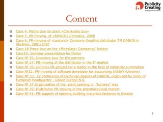 The document provides summaries of several PR and marketing projects implemented for B2B companies in Ukraine. They include media tours of manufacturing plants, PR campaigns to increase brand awareness and promote new products, seminars, conferences and incentive tours for partners. The case studies describe the objectives, activities and positive results for the clients, such as increased media coverage, strengthened partnerships and dealer loyalty, and enhanced reputation as market leaders.