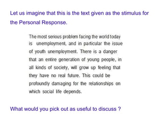 The document provides tips for extracting ideas from a text for a personal response. It advises to understand the basic idea, highlight important words and phrases, ask questions about them, select the three or four most interesting points, and organize them with a logical flow from the first to last point. For example, discussing how youth unemployment is special because it impacts young people's hopes for the future and sense of progress, which could damage society if left unaddressed.