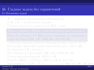 Документ описывает гладкую задачу без ограничений в контексте оптимизации, где f является гладким функционалом в линейном нормированном пространстве x. Приведена теорема, аналогичная теореме Ферма в нормированных пространствах, утверждающая, что если некоторый элемент ˆx является локальным экстремумом, то функционал f при этом равен нулю. Документ также рассматривает вариацию функционала по Лагранжу и условия, при которых это справедливо.