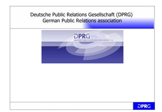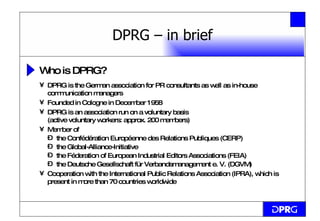 DPRG is the German association for PR consultants and in-house communication managers, founded in 1958. It is a voluntary association with around 200 active members. DPRG is a member of several European and global PR organizations and aims to exchange information about PR practices internationally and represent German PR interests. The PR industry in Germany has grown significantly, with the overall turnover increasing from 4.28 billion Euros in 2005 to a forecast of 5.7 billion Euros in 2010, and employee numbers growing by 15,000 from 2000 to 2005.