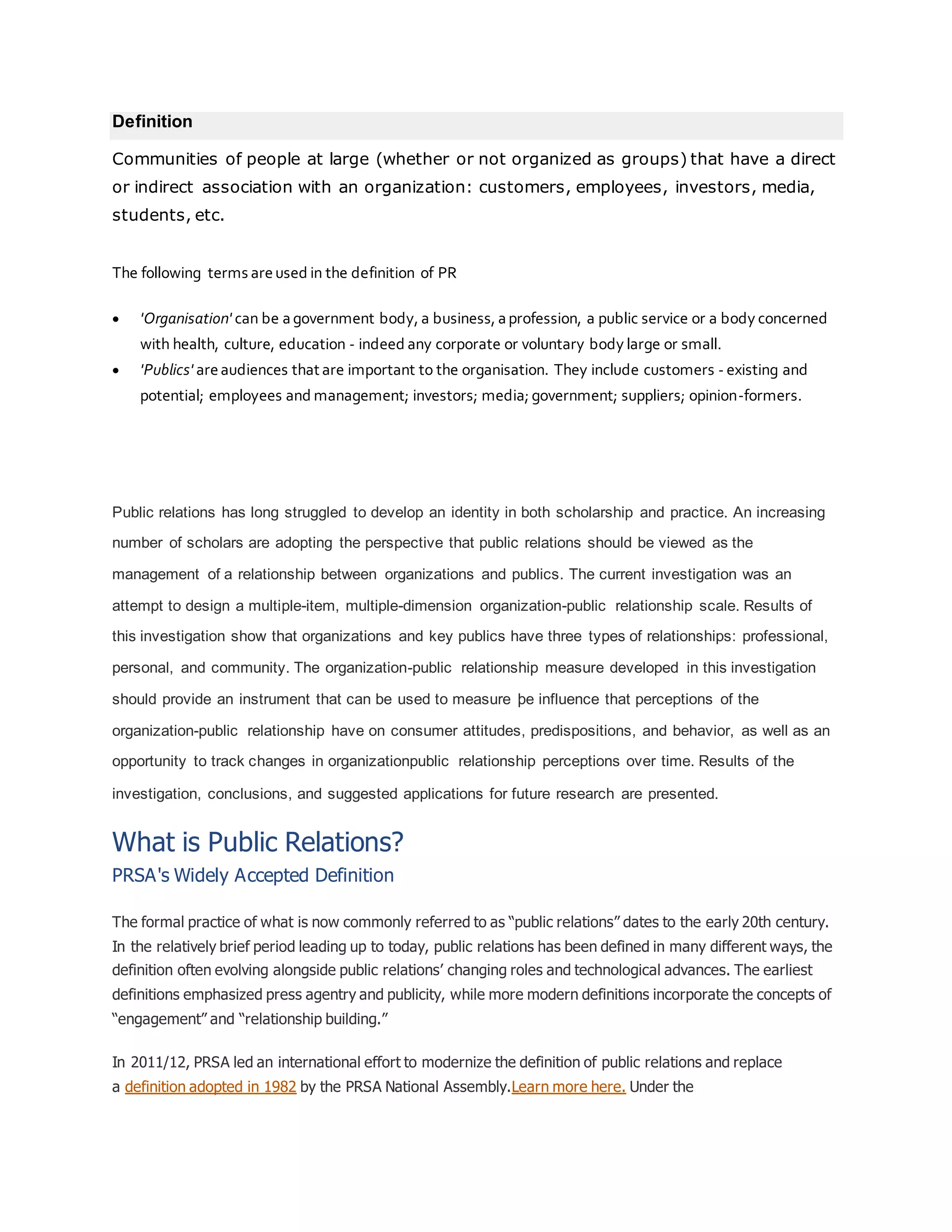 The document defines public relations as a strategic communication process that builds mutually beneficial relationships between organizations and their publics. It discusses how public relations helps bring together organizations and their key stakeholders, which include customers, employees, investors, media, and more. The document also explains that public relations involves anticipating and interpreting public opinion, counseling management, conducting research, and planning programs to achieve an organization's aims and influence policy.