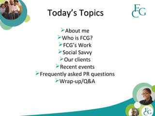 Christina C. Steed presented on perspectives from the public relations field. She discussed her background and role at Flowers Communications Group, a leading multicultural integrated marketing agency. She covered FCG's services including strategic planning, social media, and community relations. Steed also discussed the importance of social media and internships for PR professionals and answered frequently asked questions about defining PR, the role of press releases and pitches, and why PR is a valuable career.