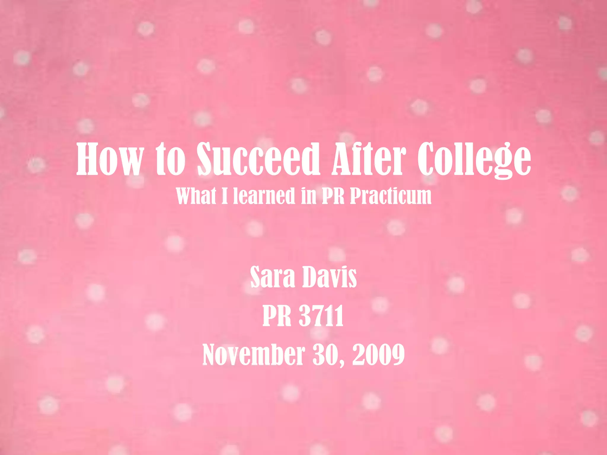 The document summarizes what the author learned in a PR Practicum course. The author learned skills for resume writing, interviewing, creating a portfolio, writing cover letters, using social media, staying current in the field, tips from a professional, the benefits of LinkedIn, the importance of networking, and different methods for job searching. These lessons will help the author succeed after college in their public relations career.