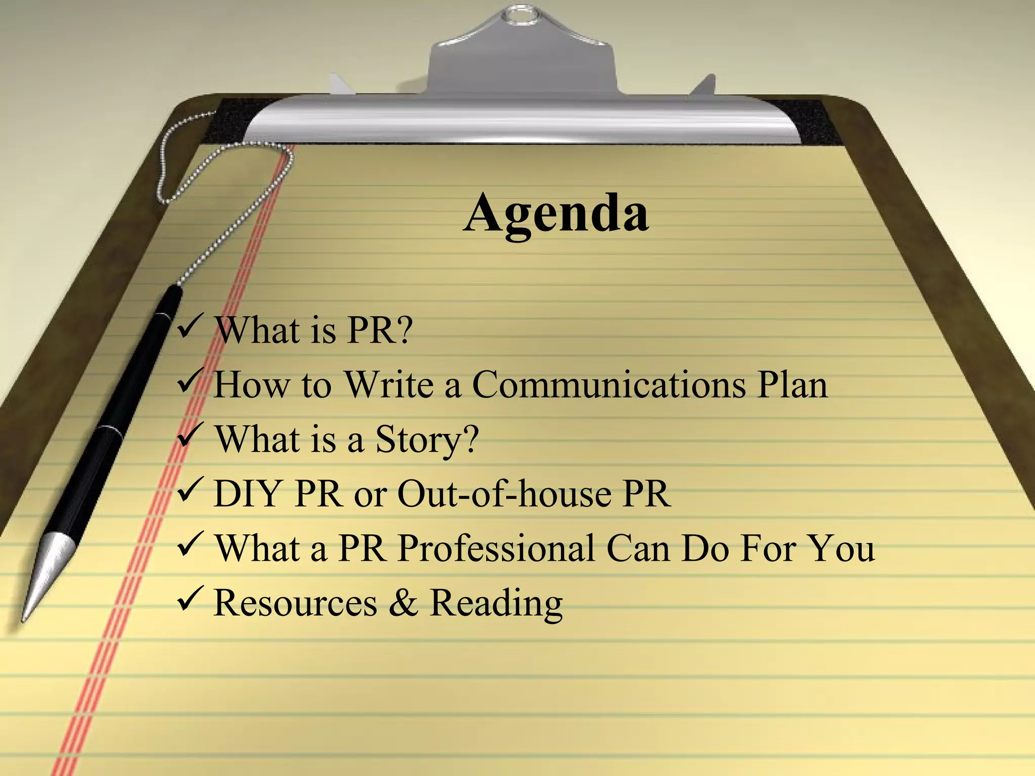 Public relations is shaping public opinion through others rather than self-promotion. A communications plan is a blueprint that outlines yearly activities to enhance a company's image and brand. It includes goals, objectives, target audiences, and strategies like media outreach, press releases, and press kits. Hiring a PR professional can help with research, planning, media relationships, and executing tactics, but costs more than doing it yourself.