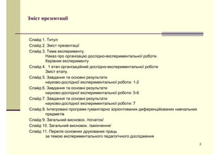 Організаційний етап експерименту за плановими науково-дослідними завдання експериментальної роботи виконано.